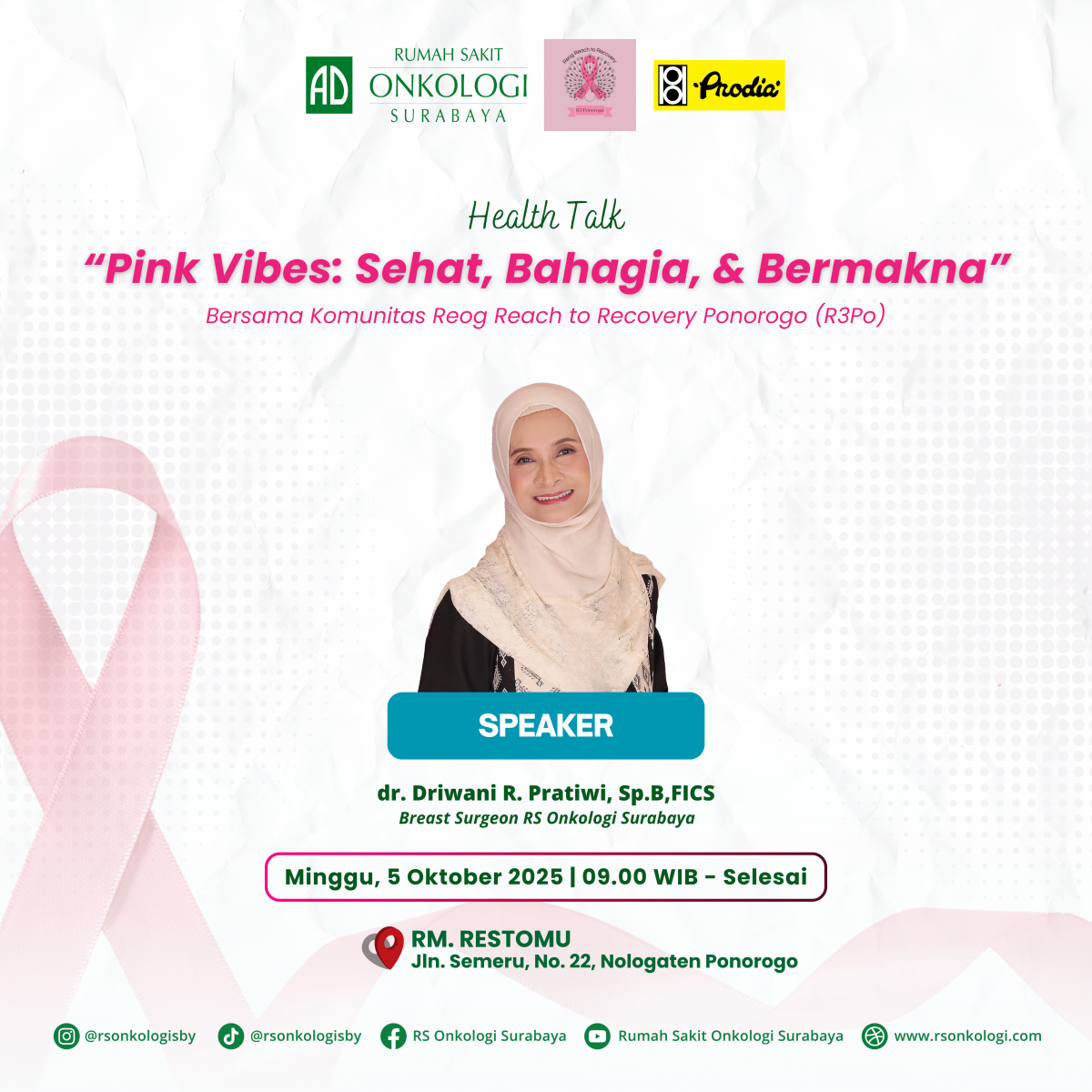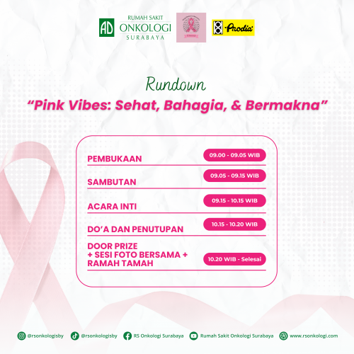 Kegiatan Health Education RS Onkologi Surabaya Bersama Komunitas Reog Reach to Recovery Ponorogo (R3Po) dan Prodia dengan Tema "Pink Vibes: Sehat, Bahagia, & Bermakna” pada hari Minggu, 5 Oktober 2025 pukul 09.00 WIB – Selesai.