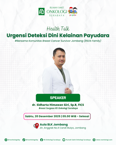 RS Onkologi Surabaya secara aktif memberikan edukasi kesehatan kepada masyarakat. Salah satunya pada kegiatan Health Education RS Onkologi Surabaya bersama Komunitas Breast Cancer Survivor Jombang (RSOS Family) dan CV. Putra Putri (Papoe Toys) dengan Tema Health Talk "Urgensi Deteksi Dini Kelainan Payudara" pada hari Sabtu, 20 Desember 2025 pukul 09.00 WIB – Selesai.