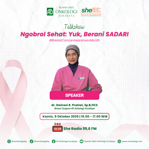 Dalam rangka memperingati Breast Cancer Awareness Month, RS Onkologi Surabaya bersama She Radio mengajak Sobat RSOS untuk lebih mengenal pentingnya deteksi dini kanker payudara melalui kegiatan “Ngobrol Sehat: Yuk, Berani SADARI”.