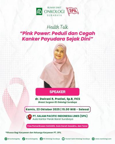 RS Onkologi Surabaya secara aktif memberikan edukasi kesehatan kepada masyarakat. Salah satunya pada kegiatan Health Education RS Onkologi Surabaya bersama PT. Salam Pacific Indonesia Lines (SPIL) dengan Tema Health Talk "Pink Power: Peduli dan Cegah Kanker Payudara Sejak Dini" pada hari Kamis, 23 Oktober 2025 pukul 15.00 WIB – selesai.