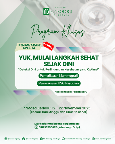 RS Onkologi Surabaya menghadirkan Program Khusus dengan harga khusus untuk pemeriksaan mammografi, USG payudara dan Pap Test. Masa berlaku 12 – 22 November 2025.