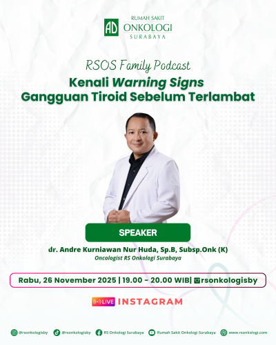 Yuk, ikuti RSOS Family Podcast yang akan mengupas tuntas warning signs gangguan tiroid bersama dr. Andre Kurniawan Nur Huda, Sp.B.Subsp.Onk (K) (Oncologist Surabaya). Cari tahu apa saja tanda yang tidak boleh diabaikan, kapan harus periksa dan bagaimana mencegah komplikasinya.