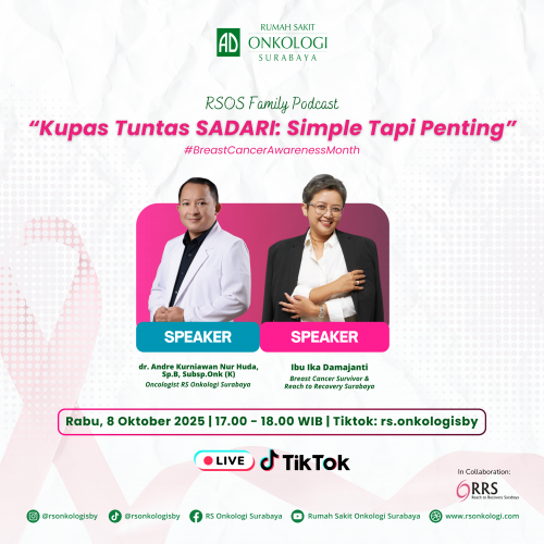 Yuk, dengarkan obrolan inspiratif di RSOS Family Podcast bersama dr. Andre Kurniawan Nur Huda, Sp.B.Subsp.Onk (K) (Oncologist RS Onkologi Surabaya) dan Ibu Ika Damajanti (Breast Cancer Survivor & Reach to Recovery Surabaya) pada hari Rabu, 8 Oktober 2025 pukul 16.00-17.00 WIB melalui Live TikTok @rs.onkologisby.