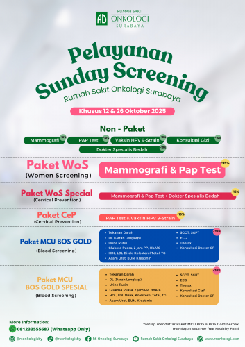 Informasi lebih lanjut terkait Program Khusus Pelayanan Sunday Screening, silahkan hubungi ke nomor Whatsapp 081233555687 atau klik link di bio instagram @rsonkologisby